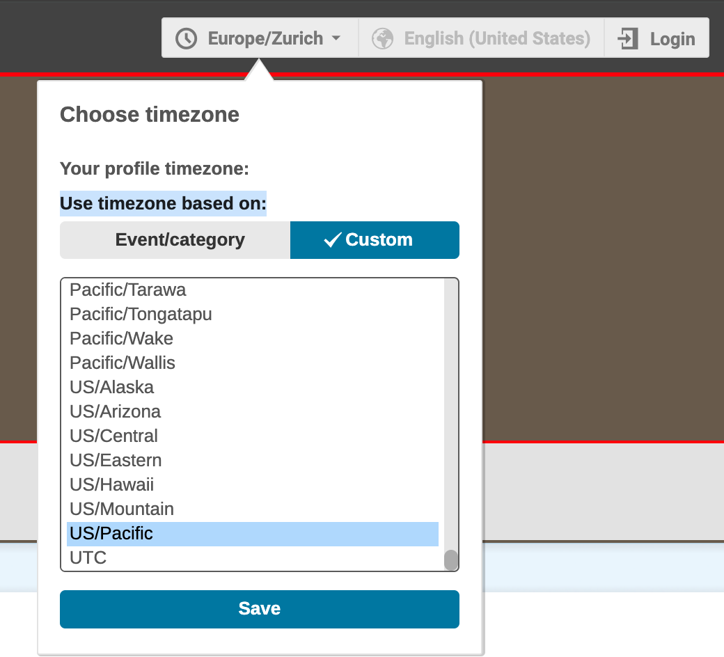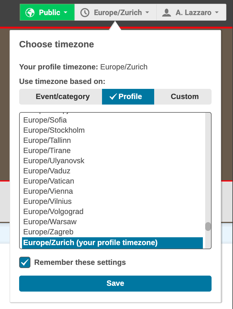 If you are logged at Indico, the timezone will default to your profile settings. You can repeat the procedure above to change it: